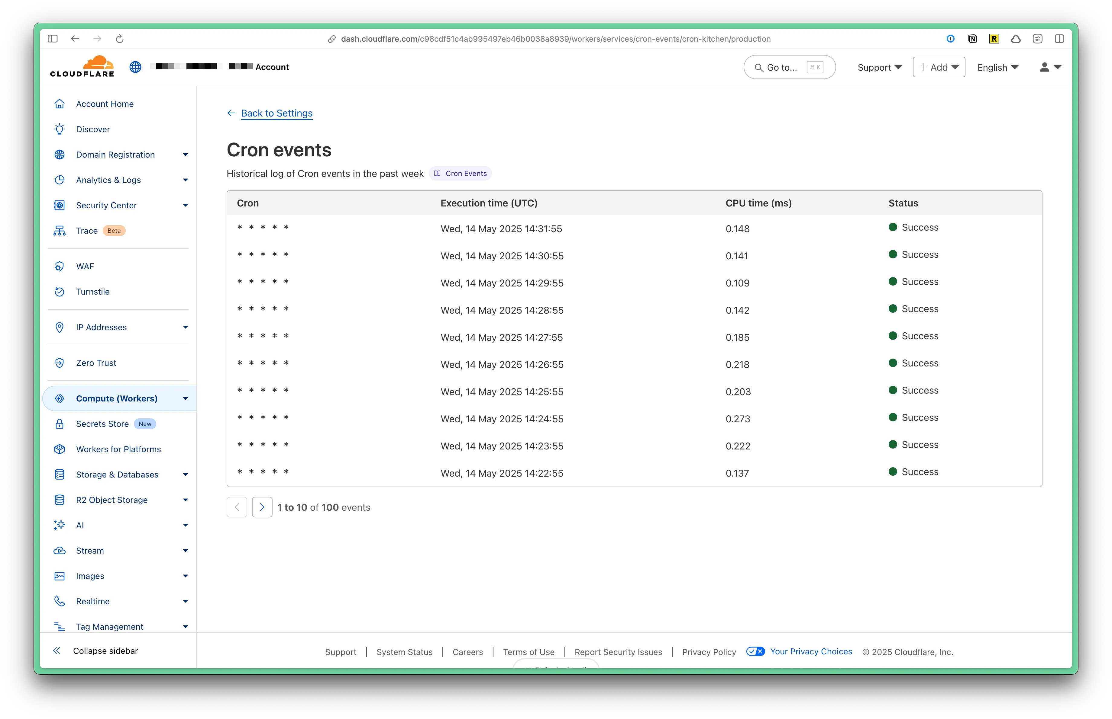 "crons": ["* * * * *", "0 0 * * *"]// Runs every hourcase "0 0 * * *":  console.log("🔄 Update something");  break;Cloudflare Cron Triggers
