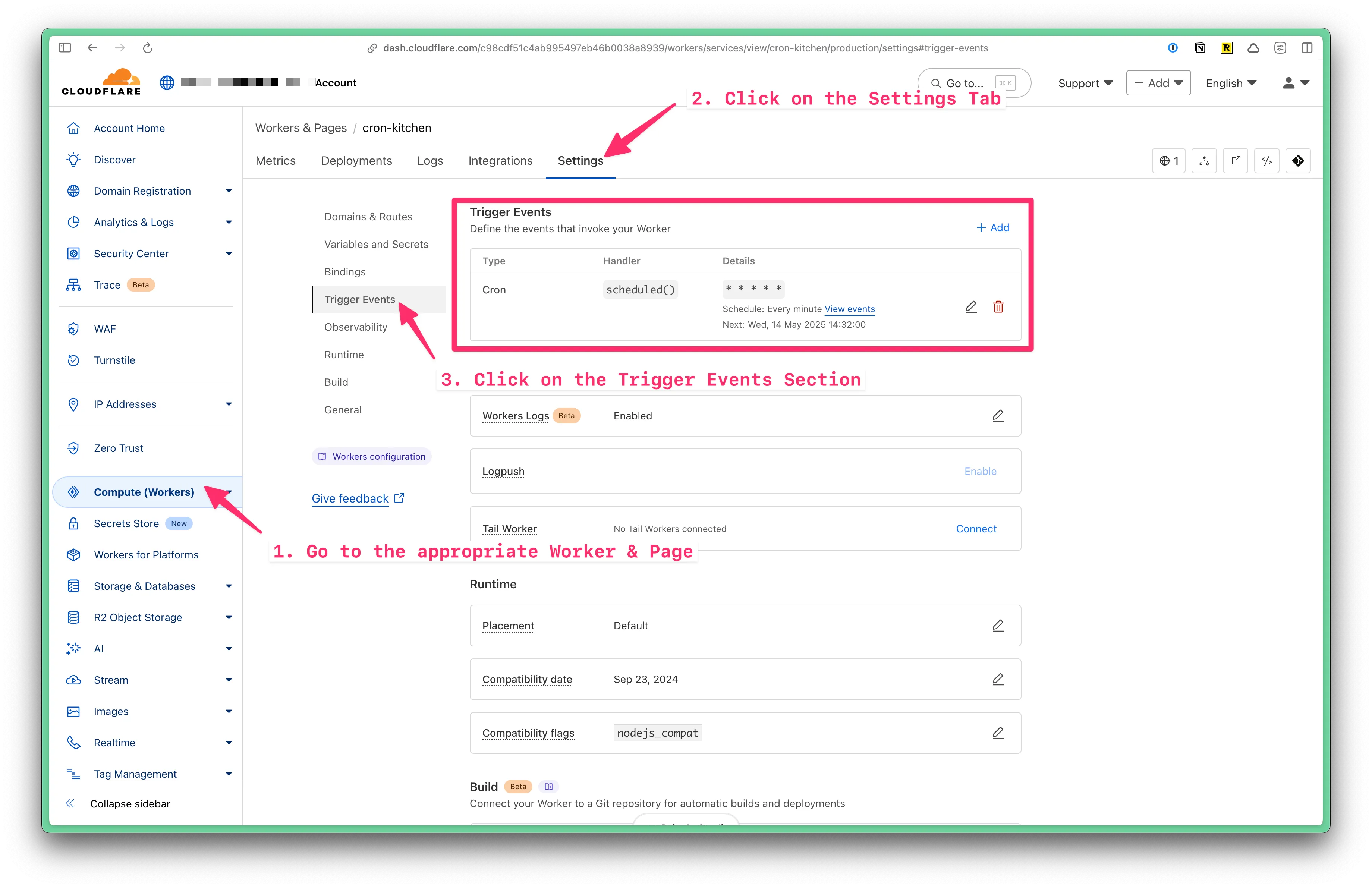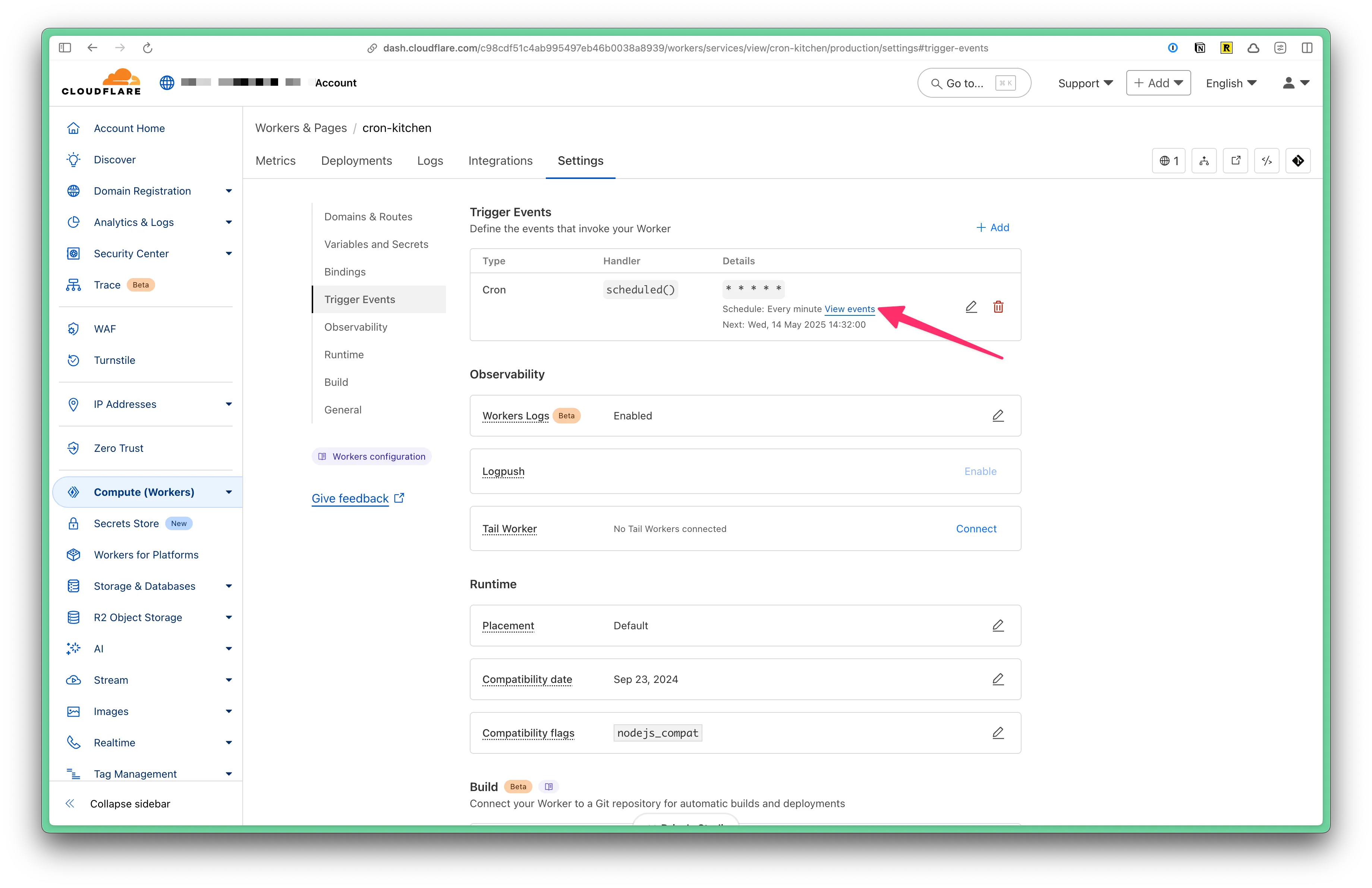 Section titled “Cloudflare Cron Triggers”Within the Cloudflare Dashboard UI, you can view all the cron triggers for your worker. Click on the Settings tab, and then click on the Cron Triggers section.
